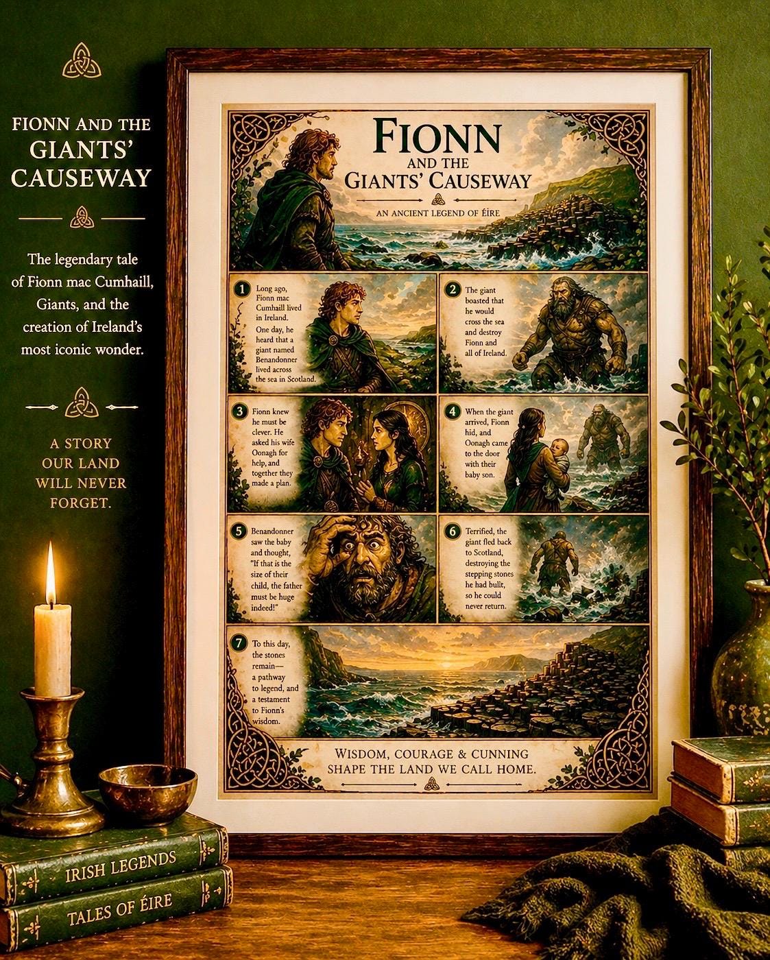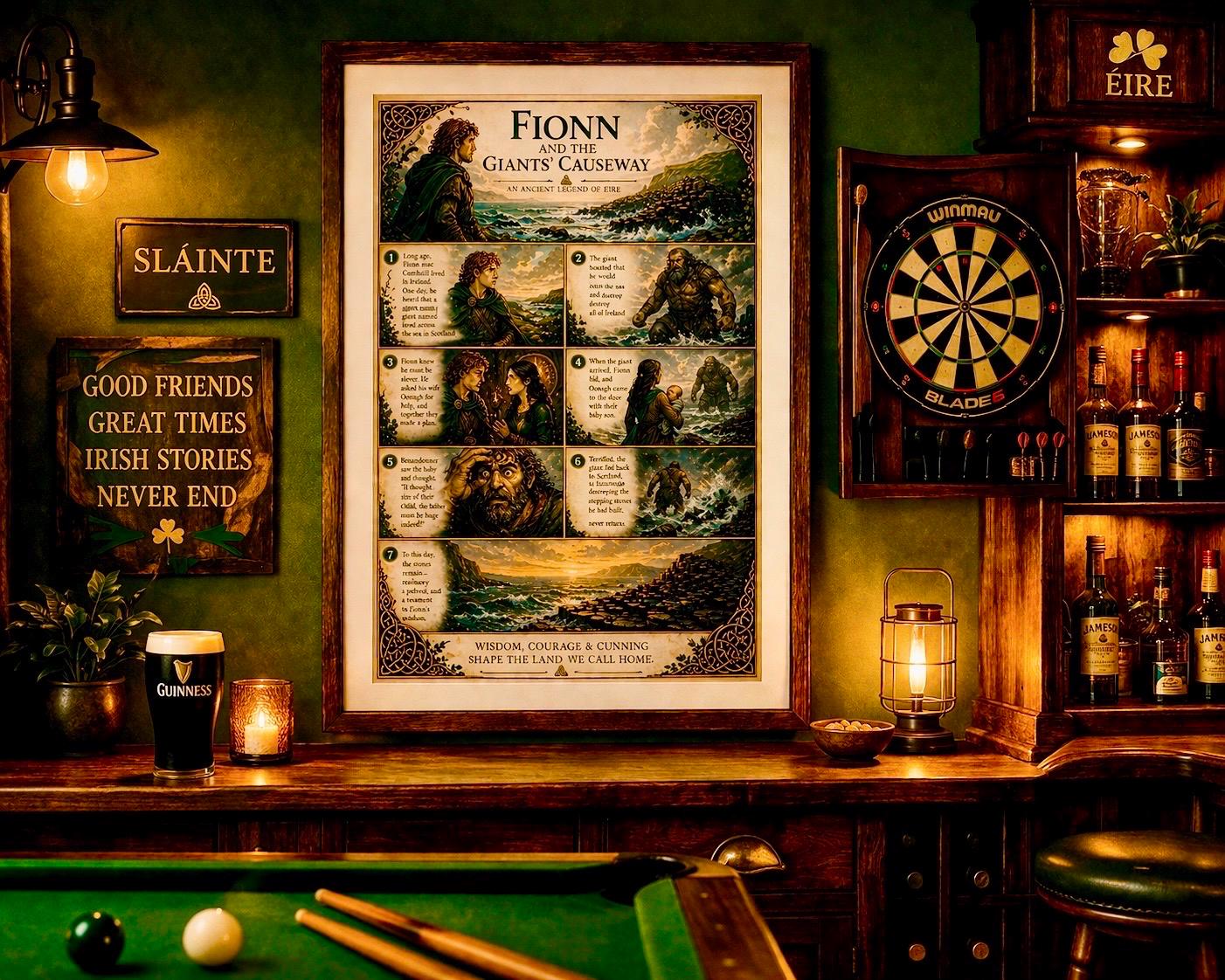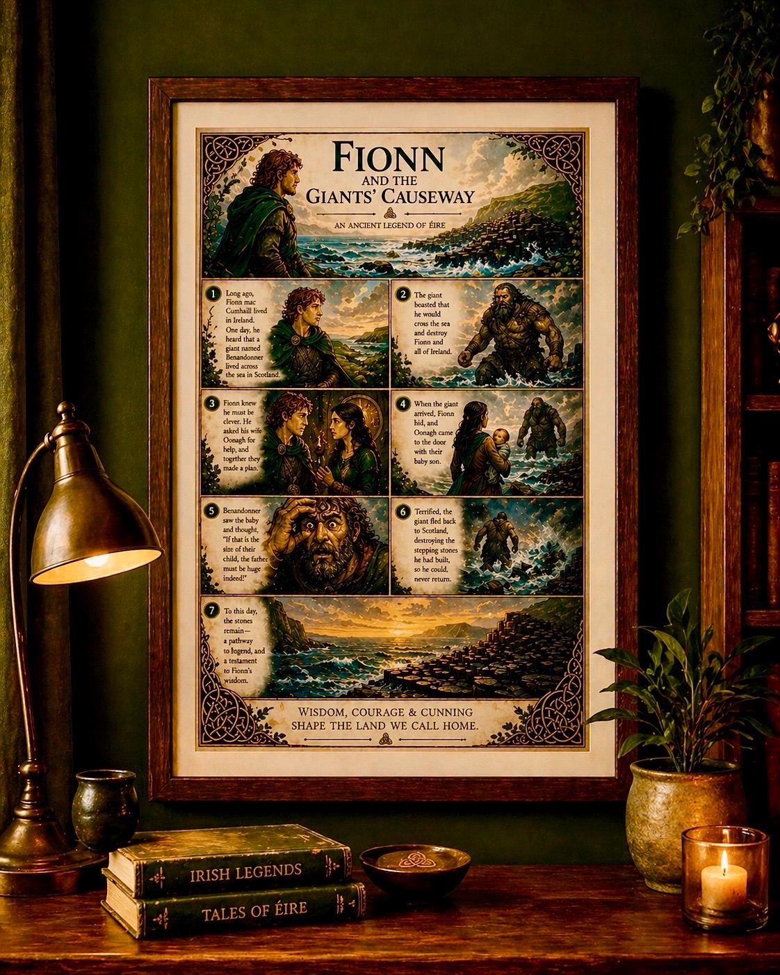 This artwork captures the story of Fionn mac Cumhaill (Finn McCool) , the legendary giant whose strength, wit, and courage shaped the land itself. Told through beautifully illustrated panels, this piece blends storytelling with rich Celtic design — creating something truly unique for your home.
