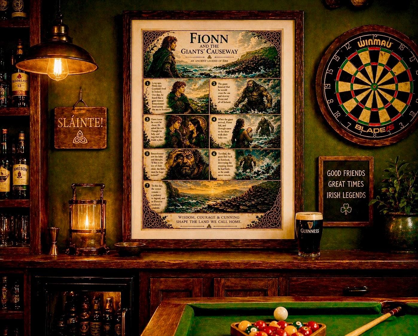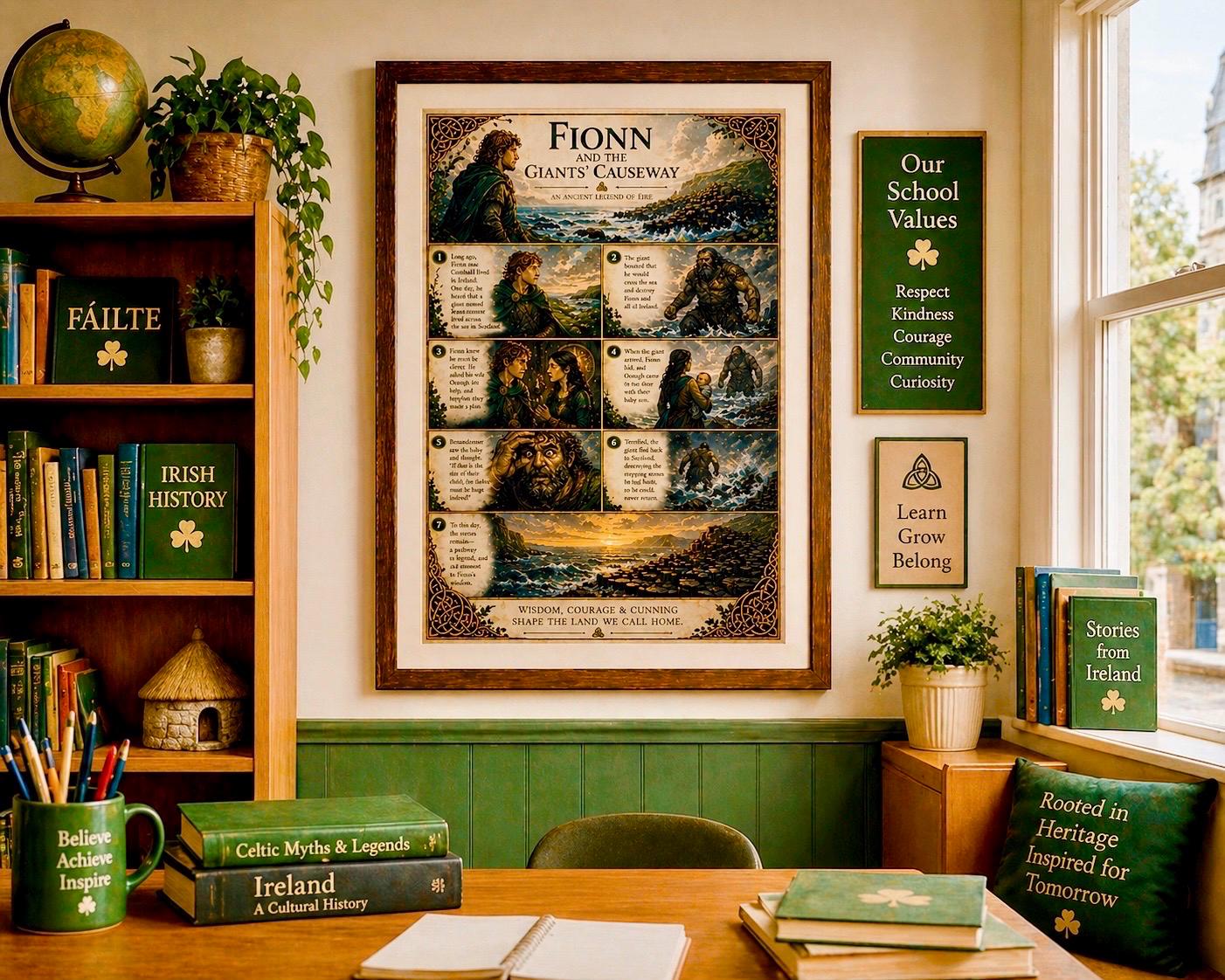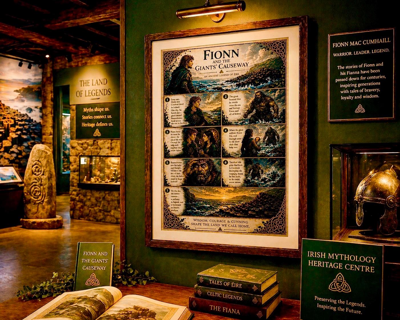 This artwork captures the story of Fionn mac Cumhaill (Finn McCool) , the legendary giant whose strength, wit, and courage shaped the land itself. Told through beautifully illustrated panels, this piece blends storytelling with rich Celtic design — creating something truly unique for your home.