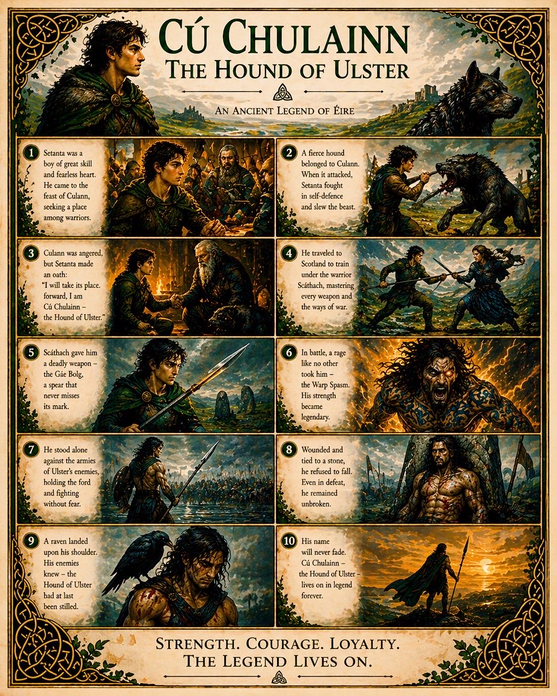 This striking artwork tells the story of a warrior bound by honour, courage, and loyalty. From his early days as Setanta to his final stand against overwhelming odds, each panel captures the essence of a legend that has echoed through Irish history for generations.