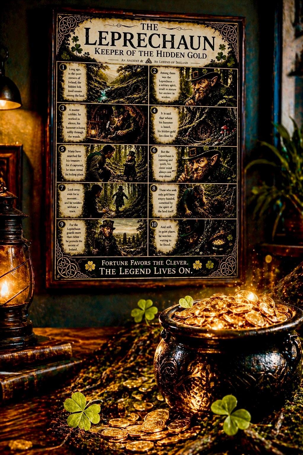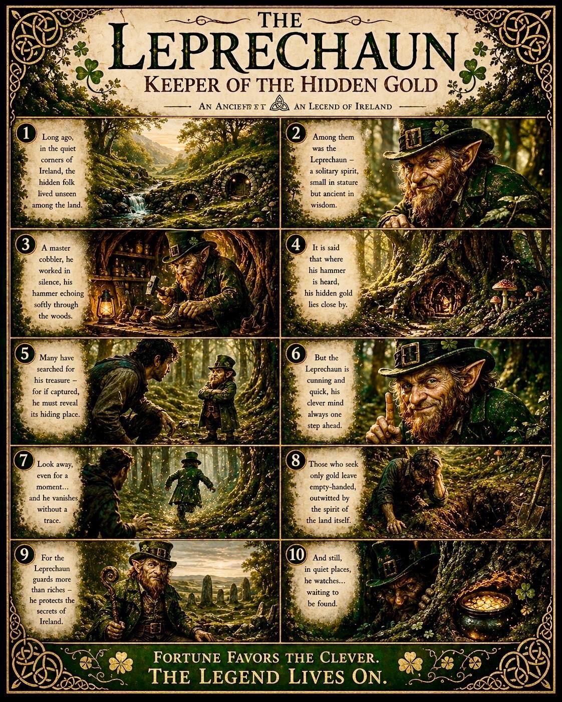 A mystical Irish folklore print telling the story of the Leprechaun — keeper of hidden gold and ancient secrets.