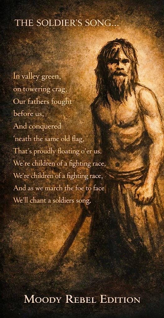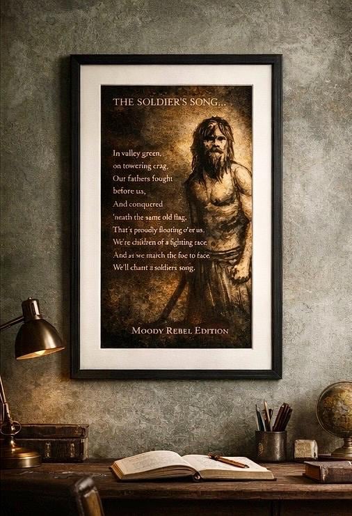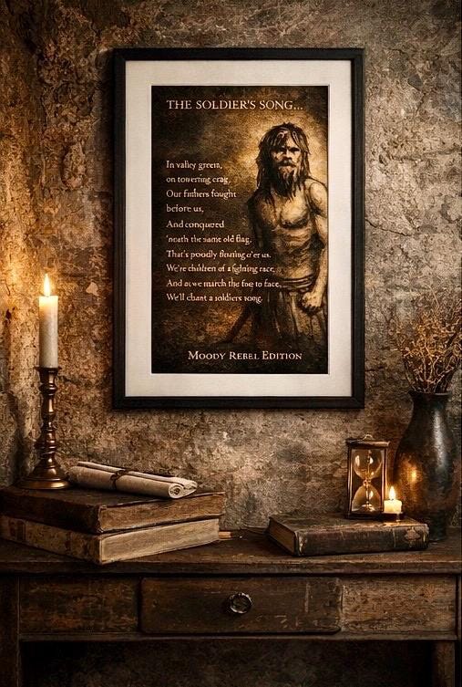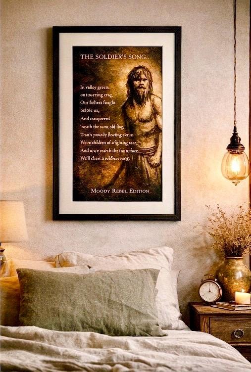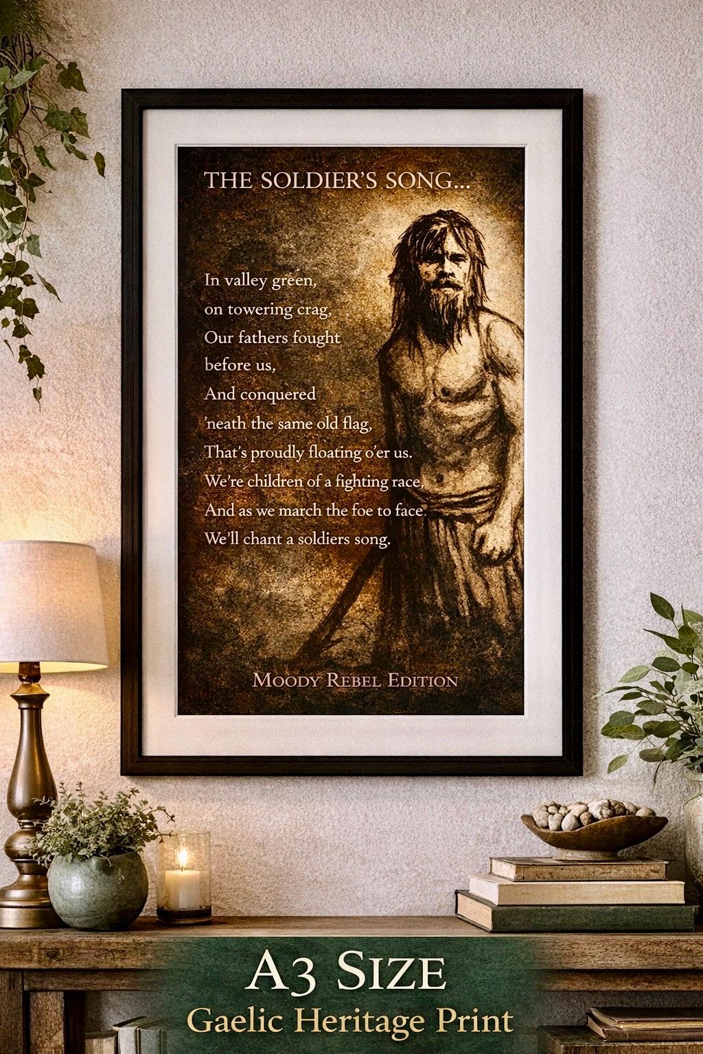 A powerful tribute to Ireland’s enduring spirit, this striking artwork brings together the words of The Soldier’s Song — Amhrán na bhFiann — with a raw, evocative illustration of an Irish rebel figure.